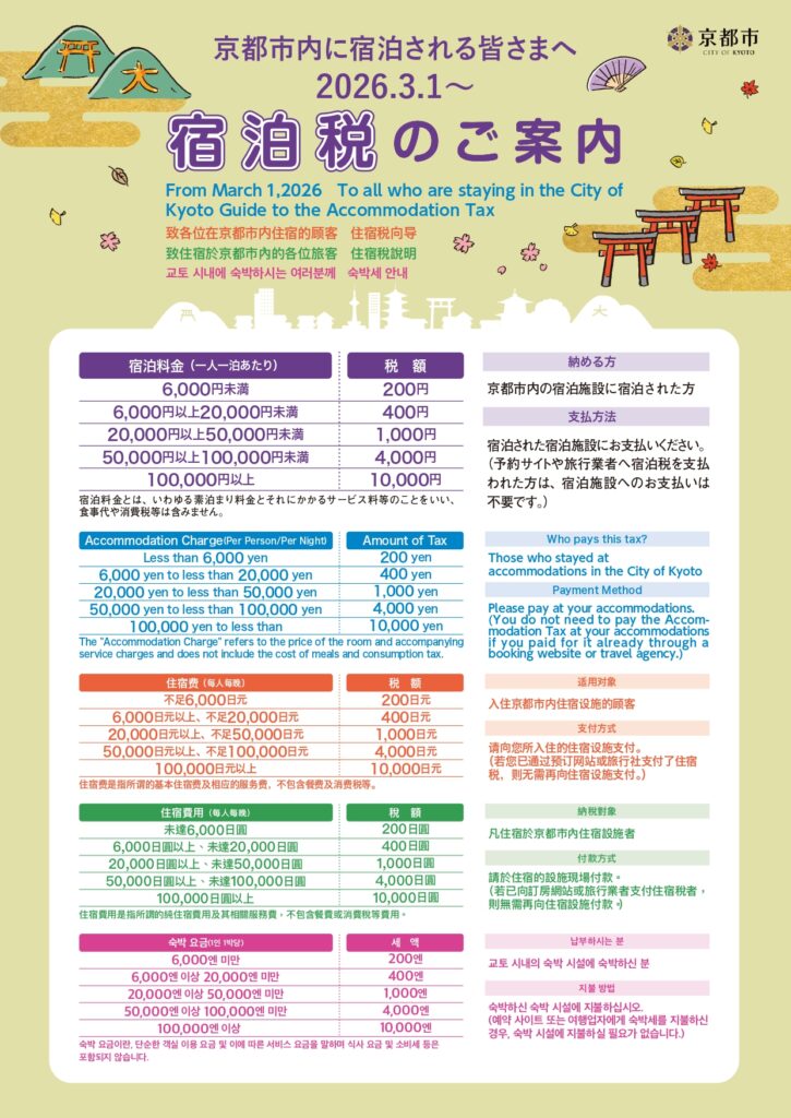 Please be advised that the Accommodation Tax, which is enforced under Kyoto City ordinances, will be revised (changed) for all stays beginning on March 1, 2026 (Sunday).